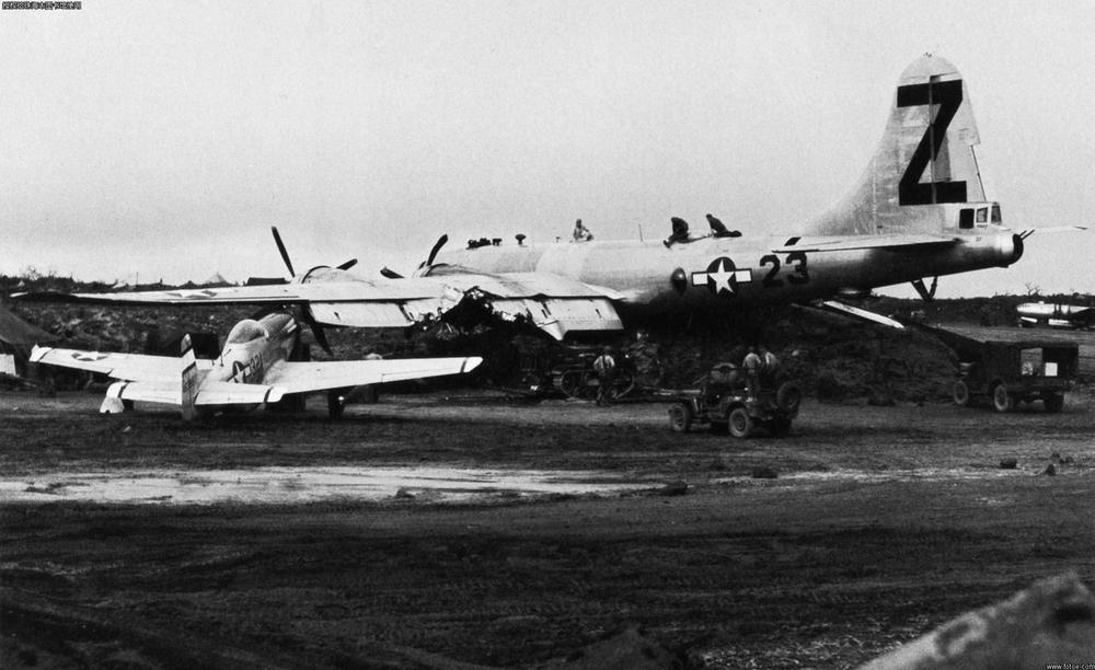 1945年,太平洋硫磺岛美军机场,维修人员在检查一架因未能成功着陆而撞上一辆卡车的B-29轰炸机。