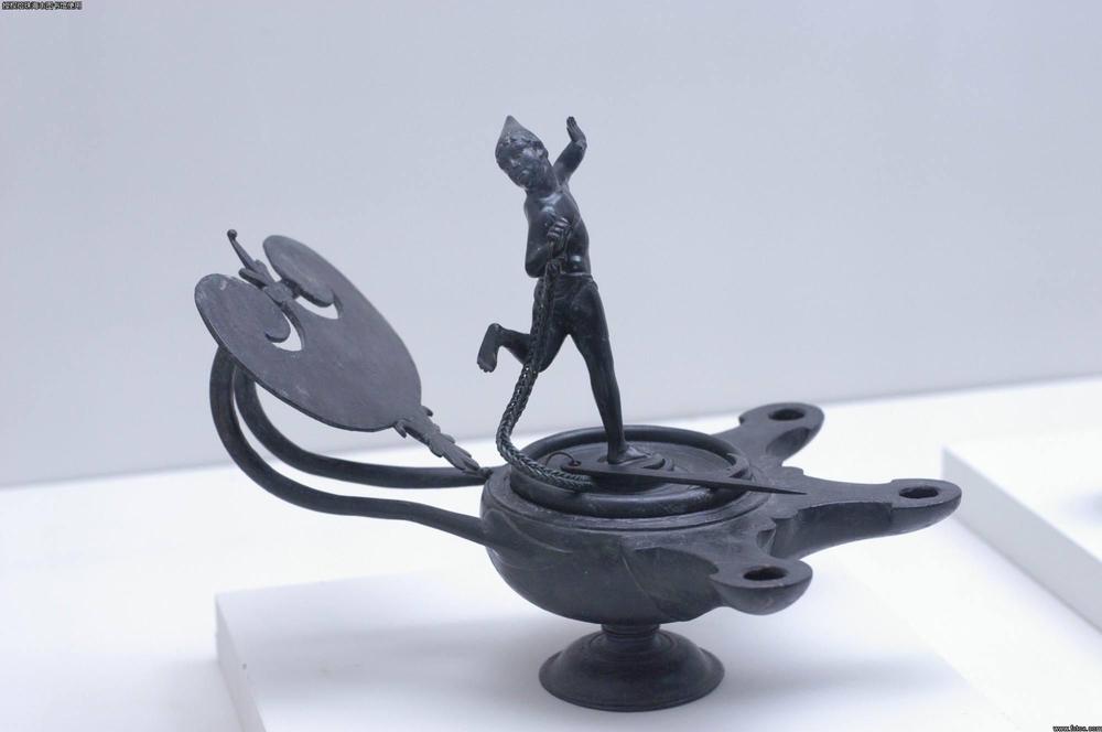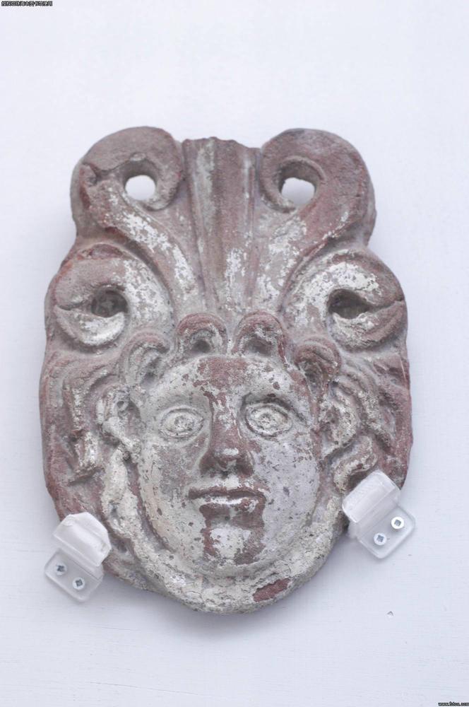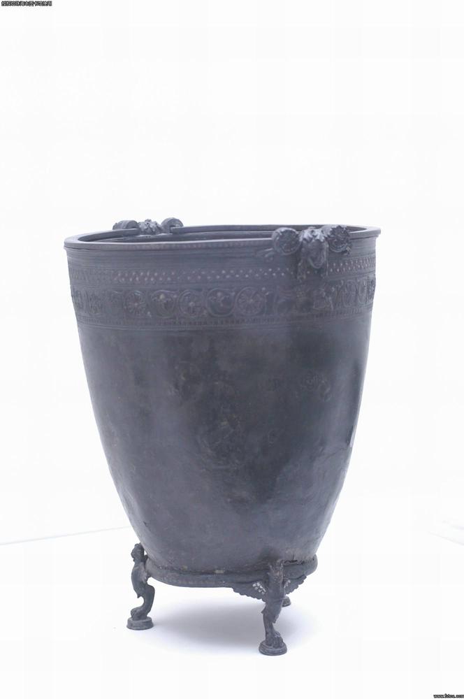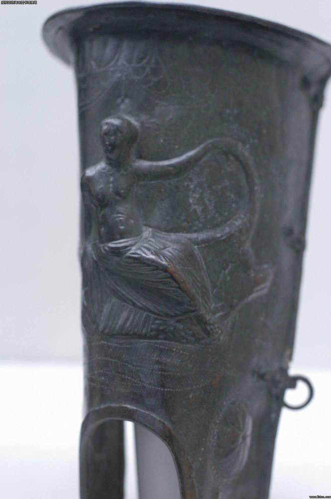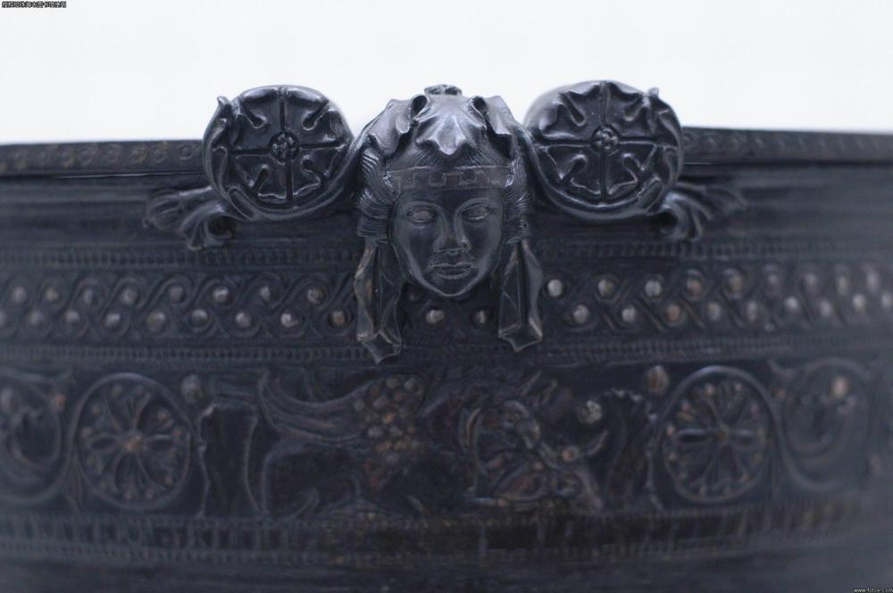 公元1世纪后半期(79年前)古罗马青铜护胫,高33.5厘米,宽16厘米,庞贝出土。 护胫用来保护角斗士的腿部,用皮条穿过两侧的环捆绑在腿上。这件护胫表面浮雕希腊人和罗马人供奉的战争女神雅典娜。雅典娜头戴头盔,手执盾牌,右手上举,仿佛投掷长矛。胸上装饰的戈耳工?美杜莎的脸,是雅典娜的象征。戈耳工?美杜莎是希腊神话中的一个妖怪,其目光能把敌人变成石头。护胫下部还装饰着雅致的植物图案。