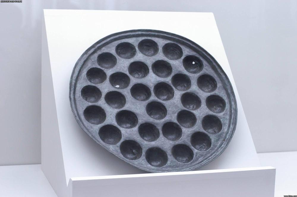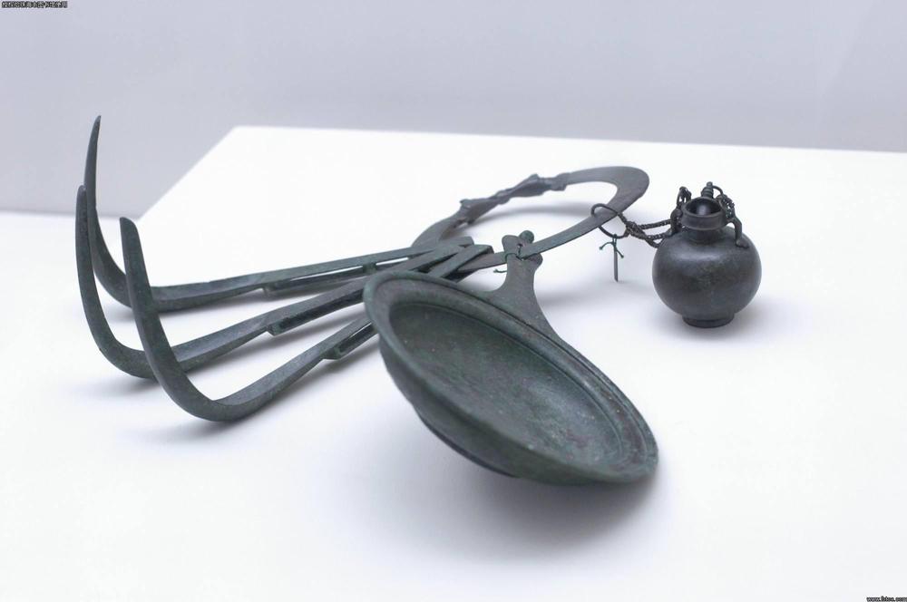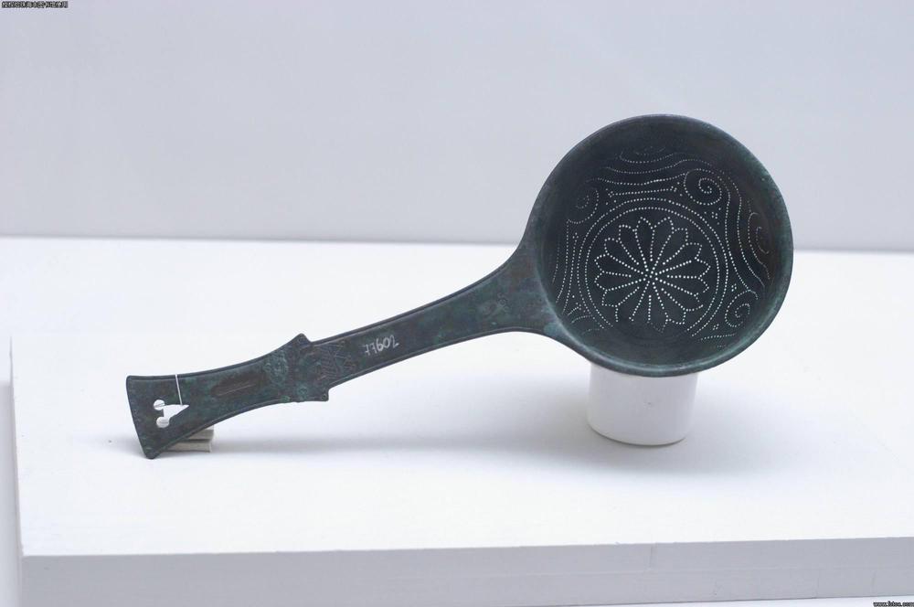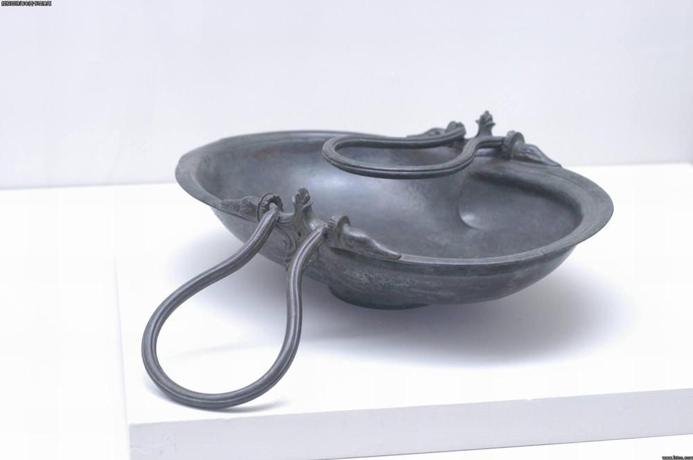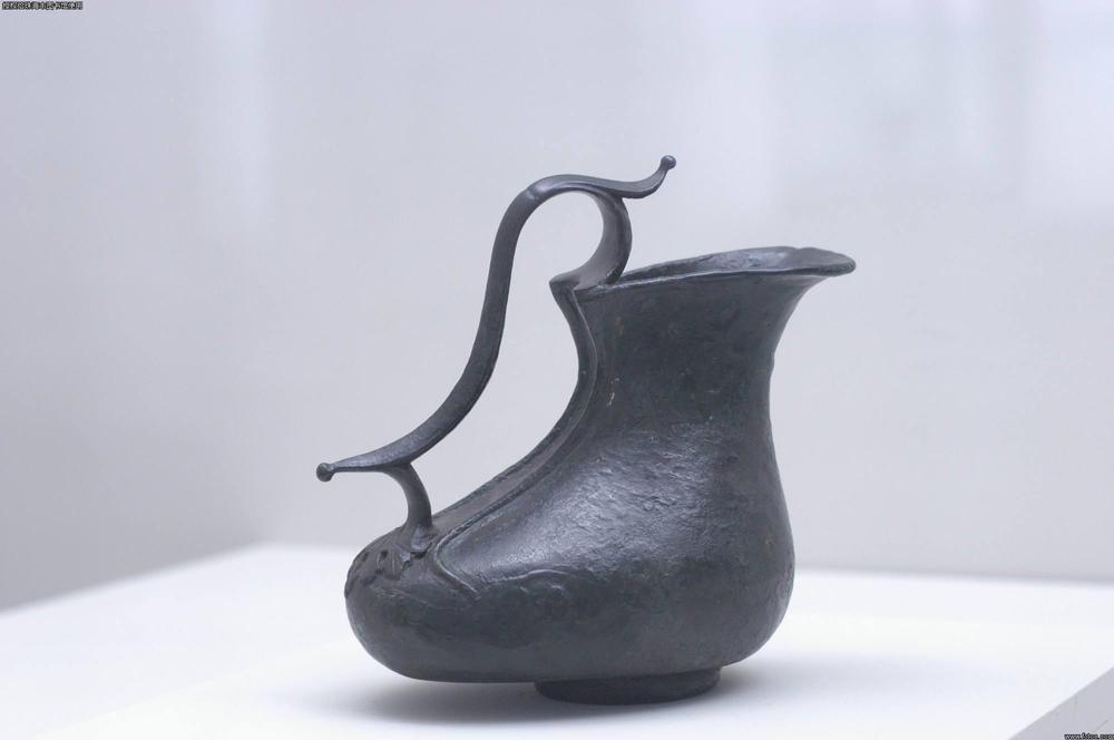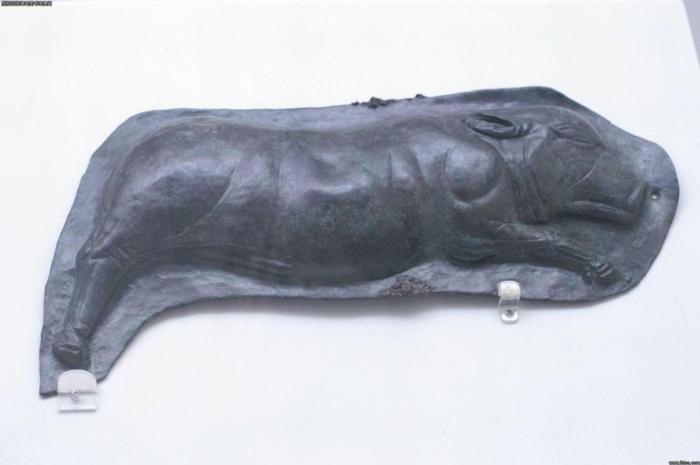 公元1世纪后半期(79年前)古罗马青铜护胫,高33.5厘米,宽16厘米,庞贝出土。 护胫用来保护角斗士的腿部,用皮条穿过两侧的环捆绑在腿上。这件护胫表面浮雕希腊人和罗马人供奉的战争女神雅典娜。雅典娜头戴头盔,手执盾牌,右手上举,仿佛投掷长矛。胸上装饰的戈耳工?美杜莎的脸,是雅典娜的象征。戈耳工?美杜莎是希腊神话中的一个妖怪,其目光能把敌人变成石头。护胫下部还装饰着雅致的植物图案。