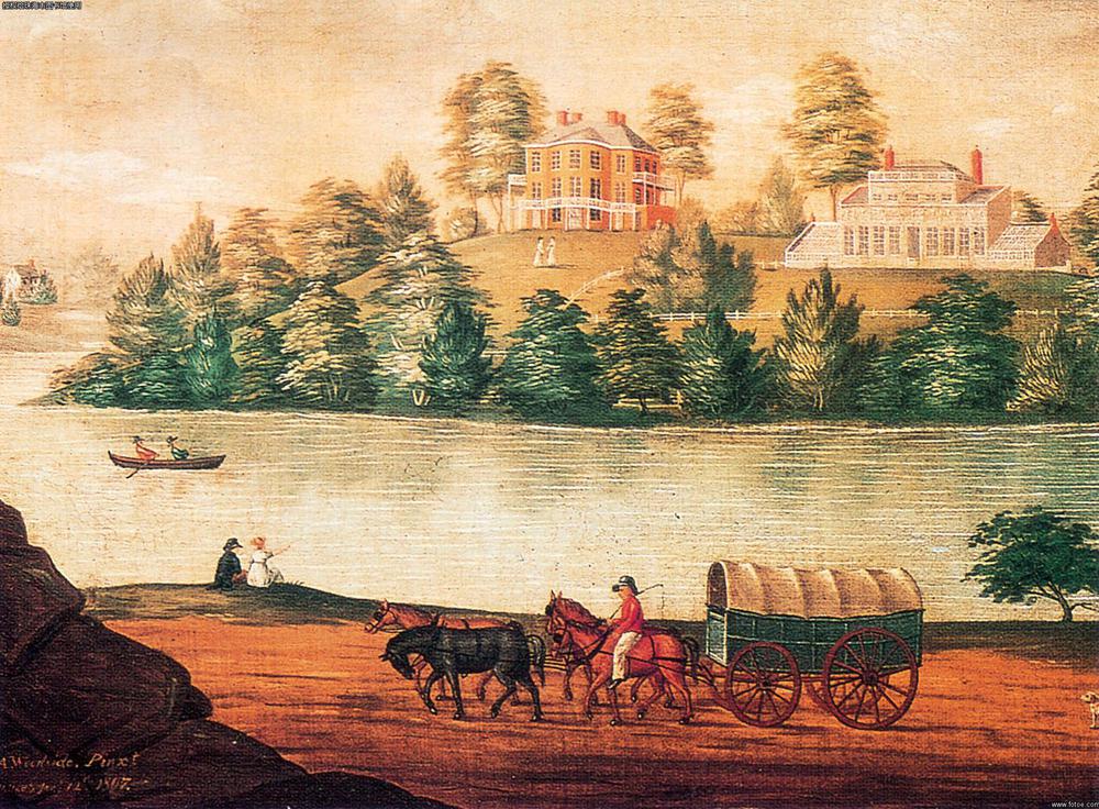 1763年绘画:打板球的人。5名年轻的北美绅士在英国的一个板球场边交谈着。从左至右:詹姆士?爱伦、鲁尔夫?沃姆利、安德鲁?爱伦、鲁尔夫?伊兹德、阿瑟?米德顿。左边的两人在伦敦学习法律,右边的3人在剑桥学习。美国独立战争开始后,詹姆士?爱伦、鲁尔夫?沃姆利是“效忠派”,阿瑟?米德顿、鲁尔夫?伊兹德参加大陆会议,成为爱国者;安德鲁?爱伦开始是爱国者,《独立宣言》发布后,也成为“效忠派”。