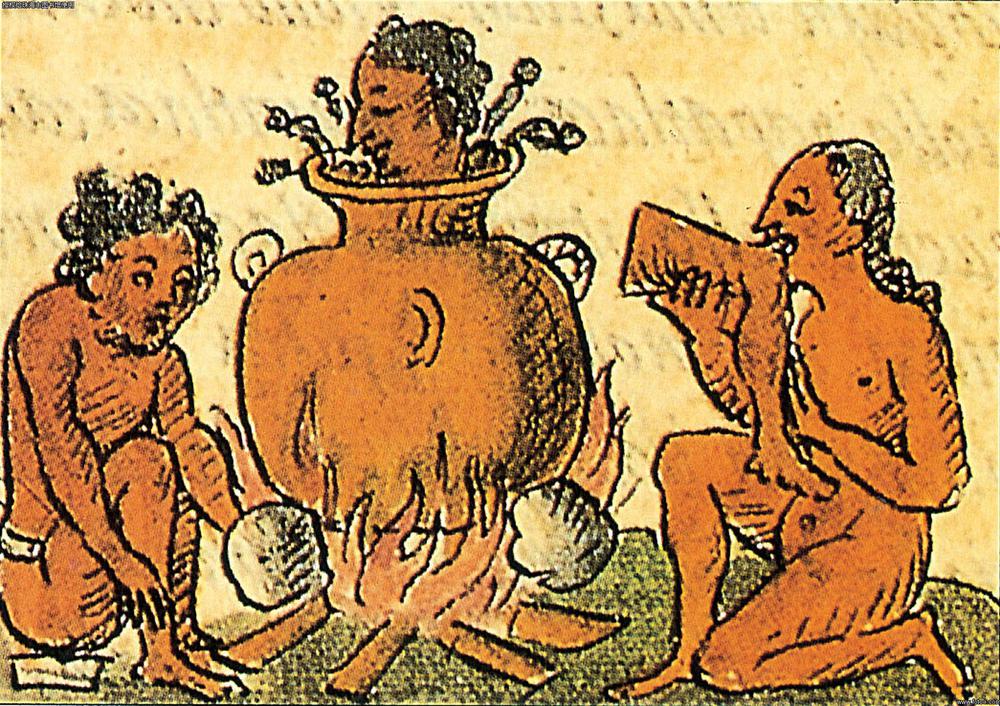 墨西哥阿兹特克人祭后,人牲被煮食。16世纪《佛罗伦萨古抄本》(《萨汉根古抄本》)插图。