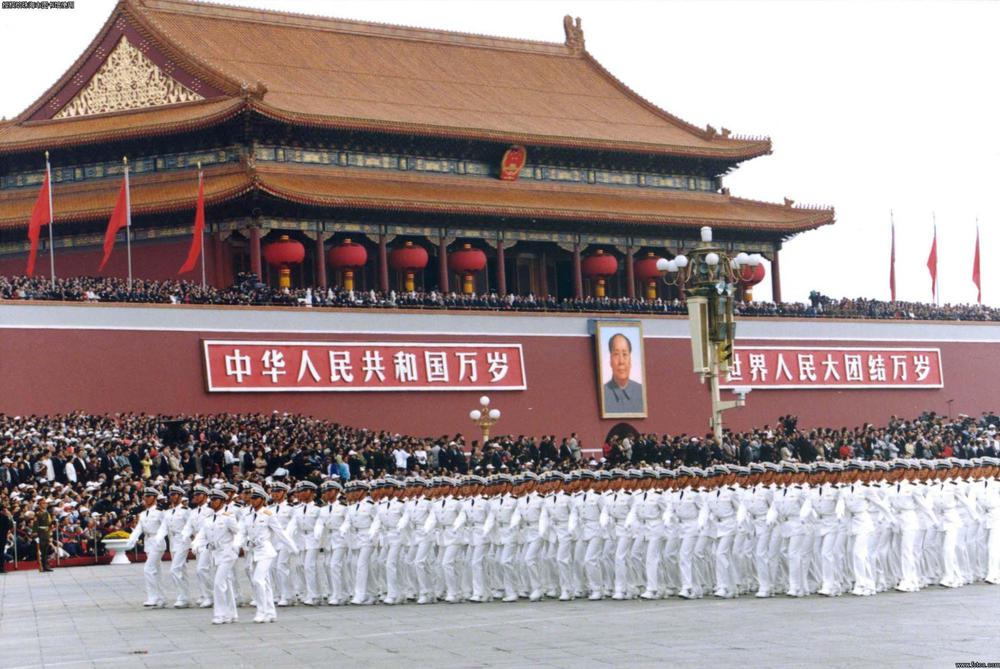 1999年10月1日,中共中央军委主席江泽民通过天安门观礼台前,驱车前往检阅中国人民解放军。