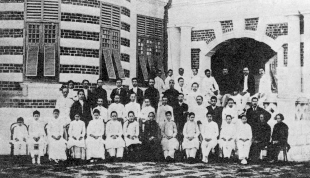 1912年2月11日,孙中山夫人卢慕贞偕同家人从槟城乘轮船回国,经新加坡与欢送人士于陈武列大厦前合照。前排中坐,着黑色衣服者是孙夫人,其双手旁是女儿孙琰和孙琬。