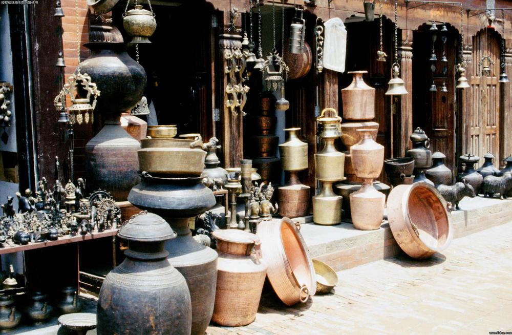 尼泊尔首都加德满都街头民间工艺品店铺。