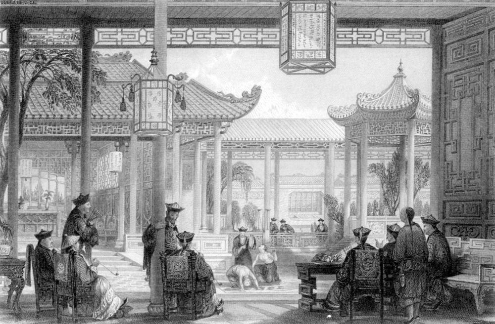 1793年(乾隆五十八年),英国马戛尔尼使团抵达杭州,浙江巡抚长龄宴请使臣并看堂会。英国画家托马斯?阿罗姆据原始素描所制铜版画。