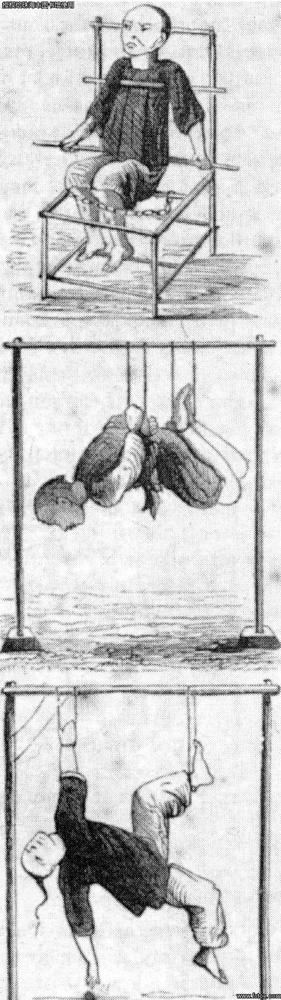 清代严刑三种。上:犯人坐在一根细木条上,臀后、胸前与脑后三根横木处于一个平面上,小腿前是一根绳索,随着绳索的拉紧,受刑者痛苦难当。中:四肢反绑吊起。下:一脚一手吊起。