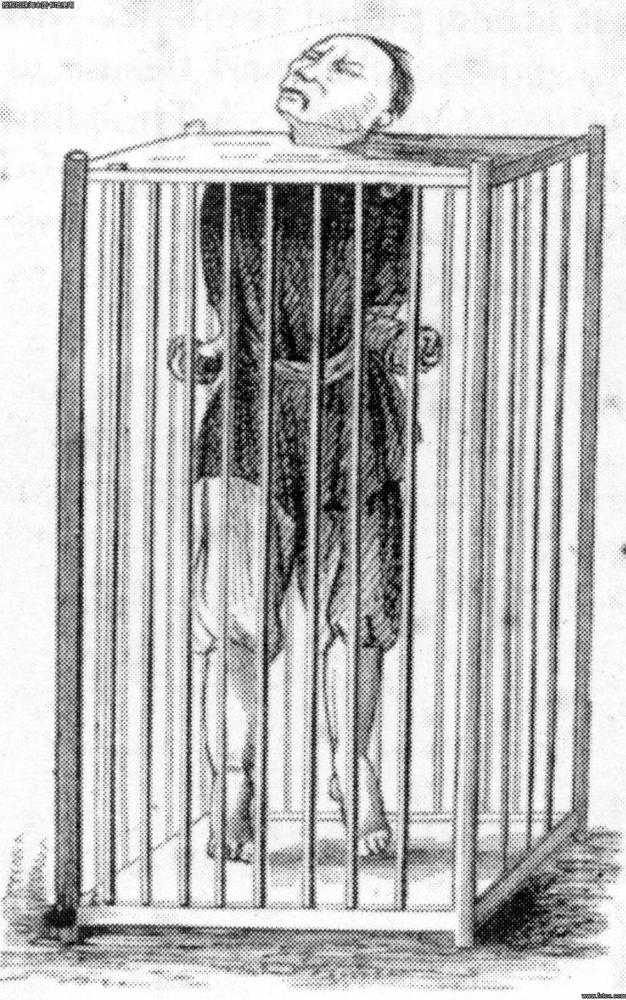 清代的站笼。颈部夹在木笼顶端孔中,受刑者被迫用脚尖站立。脚尖站立是站部长时间的,因此受刑者大多命丧黄泉。早期来华西方人所绘。