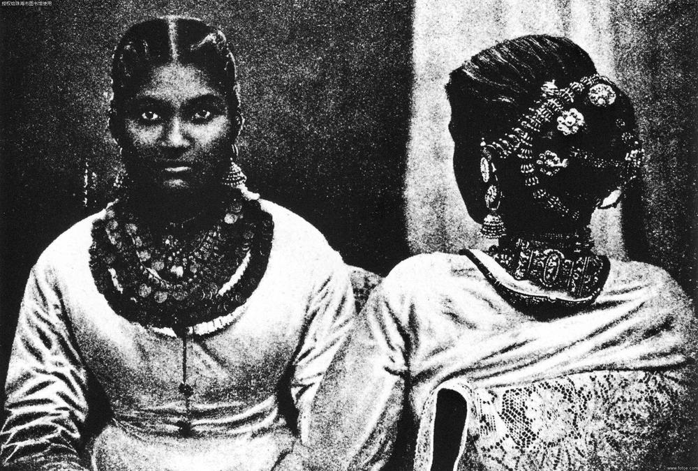 贾夫纳的泰米尔贵妇,属于居住在斯里兰卡最北端的贾夫纳半岛的泰米尔人,是南印度达罗毗萘人的分支。贾夫纳的金制品工匠以其制作工艺精美熟练而著称,金制品上常嵌有珍珠和其他宝石。他们的硬币和金箔项链是其代表作。