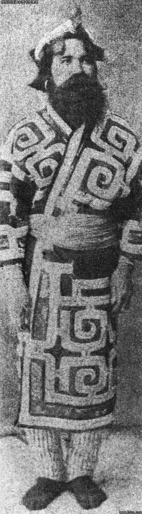 日本的阿伊努男子。这位打扮漂亮的男子体现了阿伊努人(Ainu)的短脖子,宽大手脚的特征。与日本人不同,阿伊努人走路姿势是外八字。