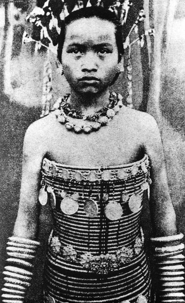 披铜戴银的达雅克美女(亚洲)。这位达雅克姑娘戴着金银丝编成的冠,镀银的小铃做成的耳环和项链以及许多银手镯。她的藤圈胸衣上饰满铜环,银币和银饰。