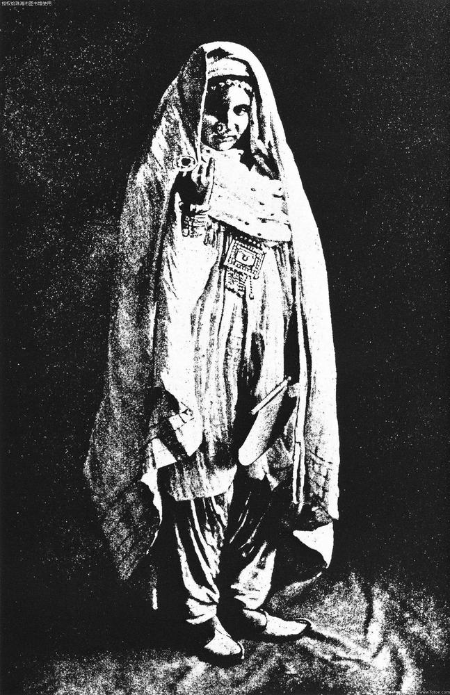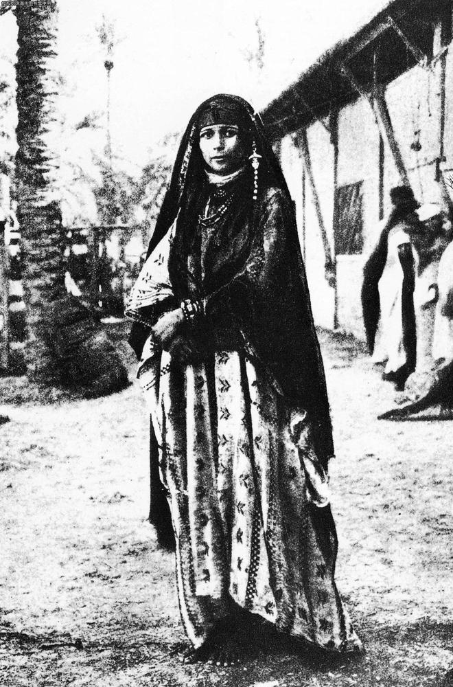 阿拉伯半岛,棕榈树下,戴着头巾、赤脚的伊拉克贵妇,在体会第一次照相的感觉。
