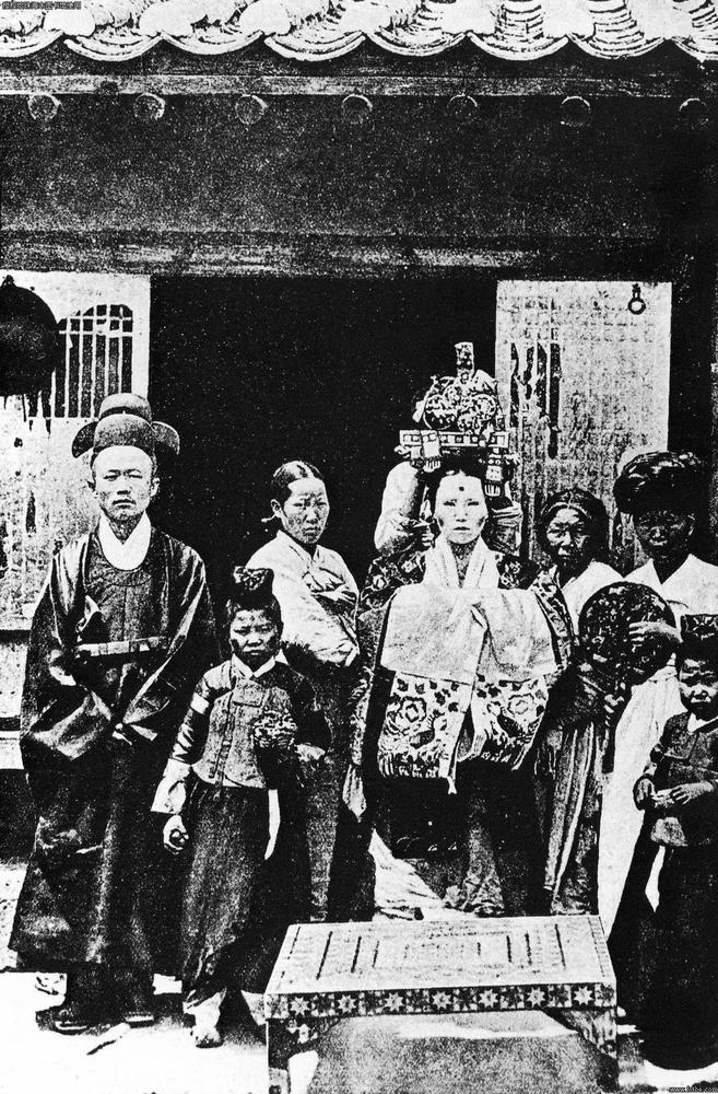 朝鲜汉城的新娘。这位新娘的前额,面颊和下巴都被点上红斑,眼镜也被蒙上了,脸上涂着白石膏,这使她显得有些奇怪。她身穿红篮相间的刺绣宫服,双手藏在披肩下。在婚礼举行过程中,一直由女傧相牵着,此时巫师给她戴好运冠。