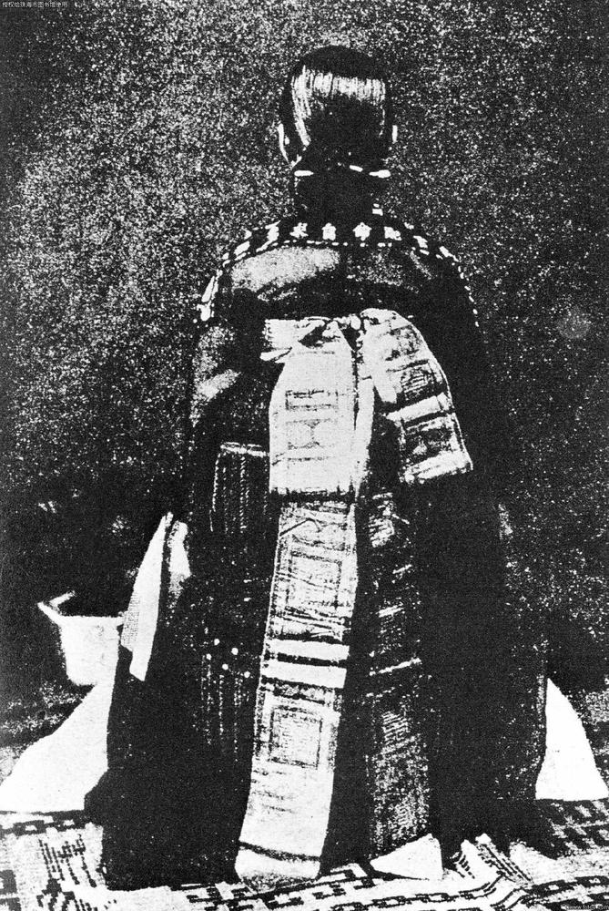 满族贵妇服饰。但她们还是受到汉族的影响――认为小脚是美的关键,照片上的贵妇把缠得变形的脚塞进了奇特精细的尖头鞋里。