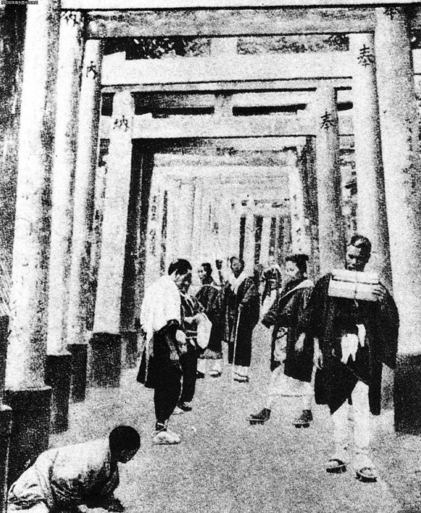 日本京都的神道寺朝拜者,他们穿过无数的牌坊把供品放到主神龛上。