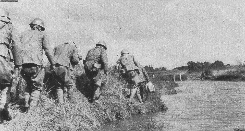 1937年10月16日,上海吴淞镇,沿河岸行进的侵华日军先头部队。