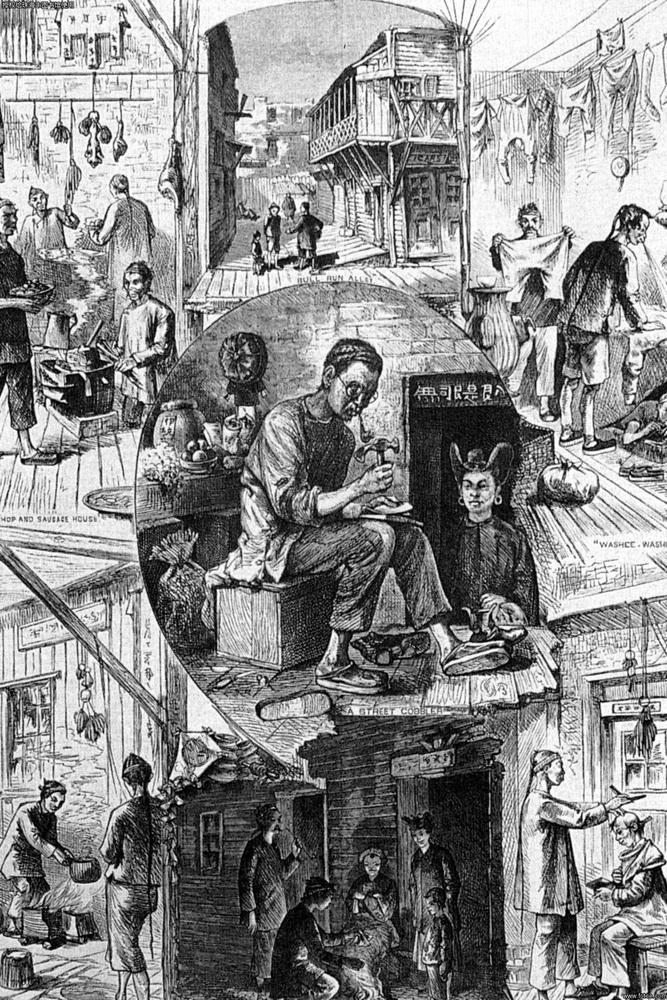 美国早期漫画:美国旧金山市白人工党在沙堆区举行排华大集会,其后演变成为袭击华埠的暴乱。