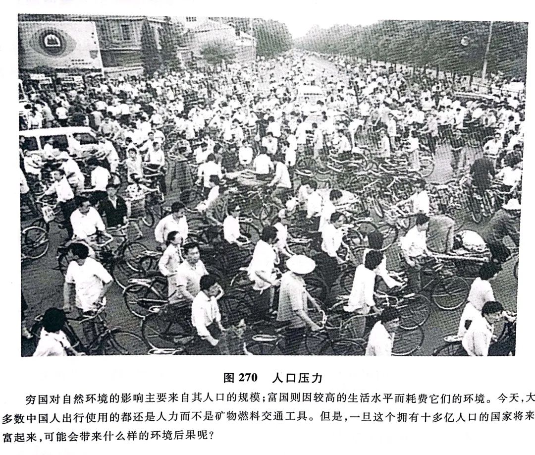 图片下方的说明文字写道“穷国对自然环境的影响主要来自其人口的规模”,此话意指中国人口过多,破坏了环境。再看后面,“今天,大多数中国人出行使用的都还是人力而不是矿物燃料交通工具。但是,一旦这个拥有十多亿人口的国家将来富起来,可能会带来什么样的环境后果呢?”结合上一句,含义不言而喻,中国贫穷时,人口过多会伤害环境,但若中国富了,庞大的人口对环境的伤害会更大。按照这个思路,中国人又该何去何从呢。每当看到类似内容,我脑海里总是不断回响丁仲礼院士对柴静采访时的反击。我们更应从人类命运共同体来考虑全世界的环境和发展问题。