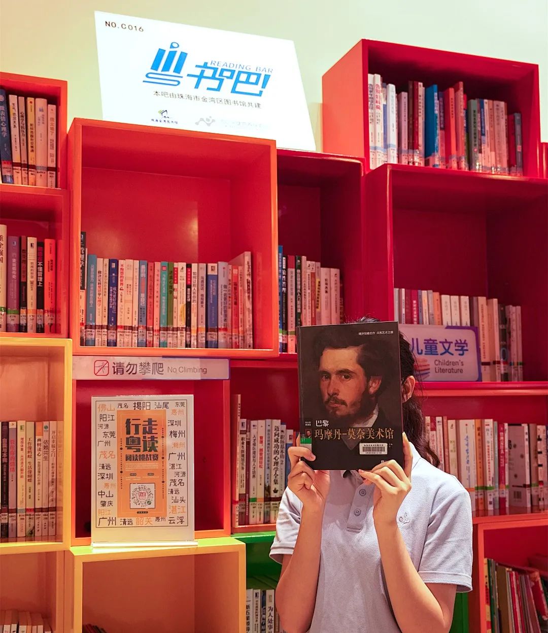 在汤臣倍健透明工厂景区营养探索馆游玩累了,没有什么是比舒服地坐下来更重要的事情。人们从科技长廊的另一端,循着咖啡浓郁醉人的香气来到景区内咖啡艺术空间的一隅。远远望见一片杂志封面大片般七彩斑斓的落地书架,图书脊背多彩的颜色点缀其间犹如跳跃着欢快的节奏,你的内心不禁欢呼:“就是这里了。”它,便是由金湾区图书馆重点打造的金湾区第三家粤书吧——汤臣倍健“粤书吧”。