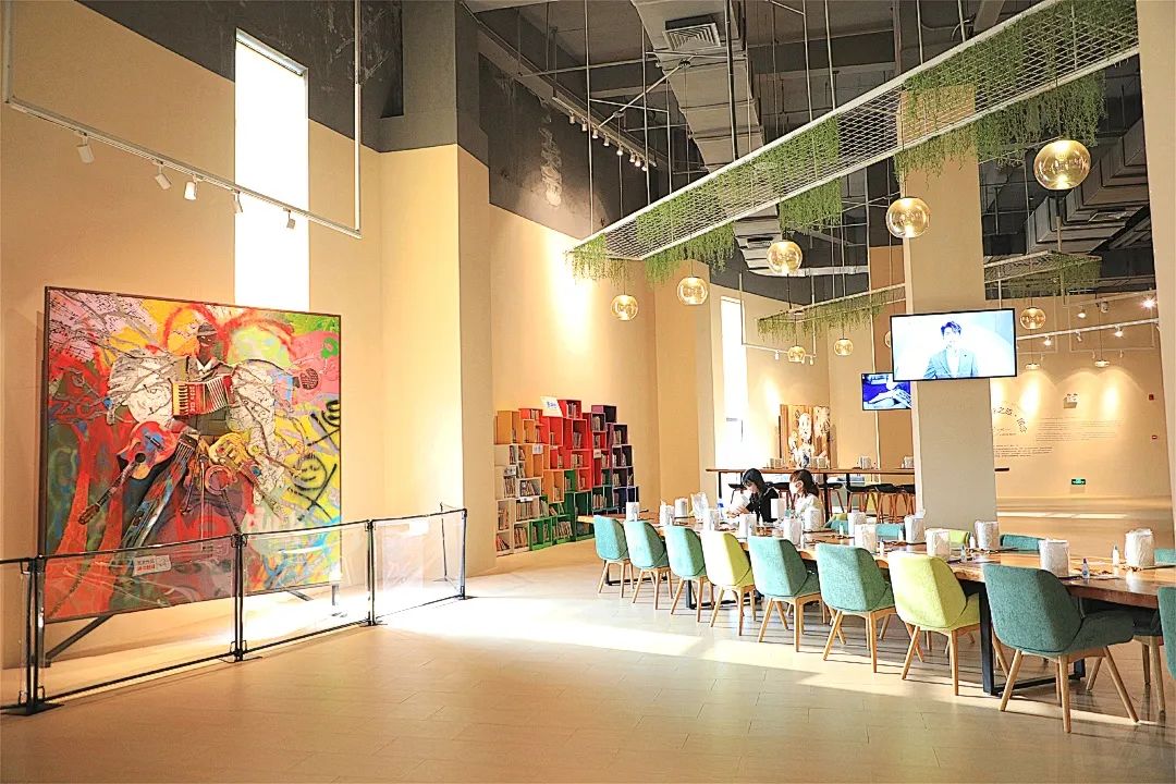 游客游玩了一日,来到汤臣倍健“粤书吧”稍事休息。人们找椅子坐下、或倚在书架旁,从书吧中挑几本可意的好书,再点上一杯健康的饮品,不时回首欣赏几幅印象派画作。守在书架旁的、或坐在桌边的人,无论是男女还是老幼,都能享受阅读带来的乐趣。清新氤氲的香气中,这些用爱意和健康理念缓慢制作的饮品,给他们的身心注入了不一样的惬意安定。光影变幻下,身旁由当代新兴艺术家创作的画作直击人心。读书、喝咖啡、品艺术,朋友们之间相互交流收获和心得,这份温柔简单的小幸福,不被打扰的休憩时光,正是我们平凡人所向往的生活。