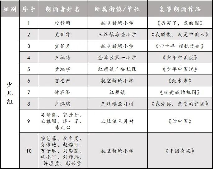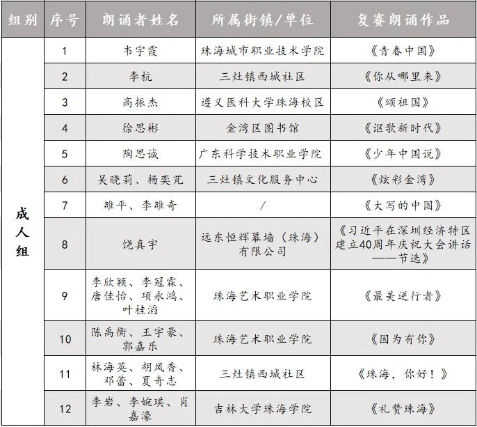 朗诵,遇见一群人,美好一座城。第十七届“书香金湾”读书节——朗诵比赛复赛选拔工作已经结束,经过专家的评审,20余组进入决赛的选手已新鲜出炉。现将晋级决赛名单及相关事宜公布如下: