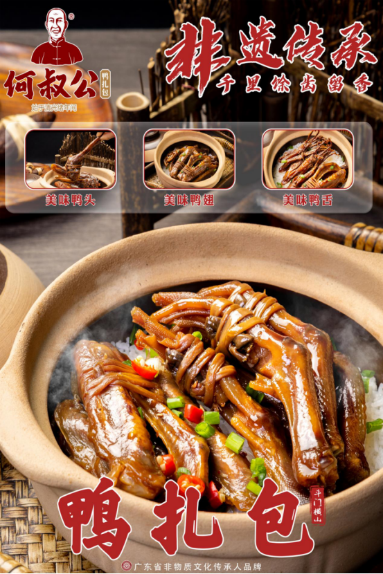 “何叔公”横山鸭扎包是广东省级非物质文化遗产。源自清光绪年间,历经四代人的百年传承,千里唇齿留香。横山鸭扎包于2013年8月名列广东省非物质文化遗产名录,第三代代表性传承人何锦洪先生被授予非遗传承人;第四代传承人何达聪创办了珠海洋博食品有限公司,推动“何叔公”品牌横山鸭扎包迈向品牌化、产业化之路,代表家族后人对鸭扎包传统工艺的正味传承和永续发展,令“何叔公”鸭扎包产品不断受到更多食客青睐的美好夙愿。