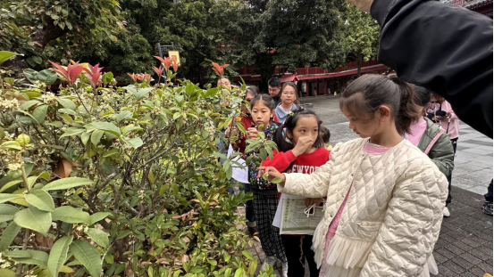 陈老师带领大家走进市文化馆中庭,近距离感受春天的生机盎然。他一边引导大家观察庭院里的植物,一边细致讲解,参与者们兴致勃勃地触摸叶片、嗅闻花香,不时提问互动。在陈老师的生动解说下,一草一木都仿佛有了故事,大家不仅认识了岭南常见植物,更在盎然春意中体会到了自然与生活的美好联结。