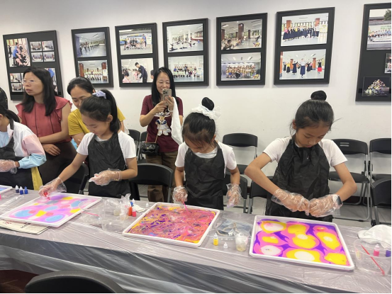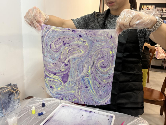 在老师的指导下学员们挑选出自己喜欢的颜色滴液亲手调制植物染液,用特制画锥在水溶胶液面上自由创作,尝试设计属于自己的DYI水拓丝巾作品。