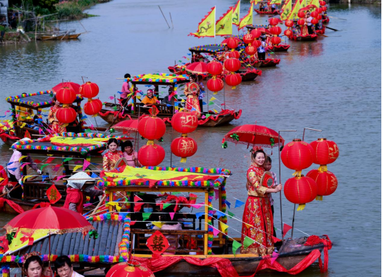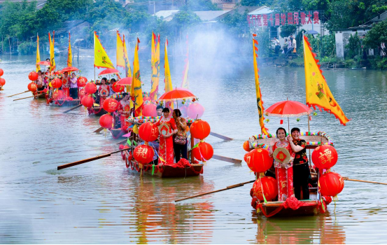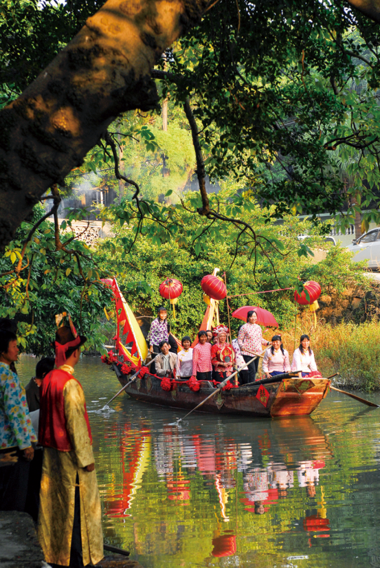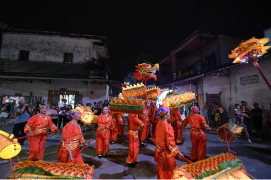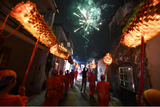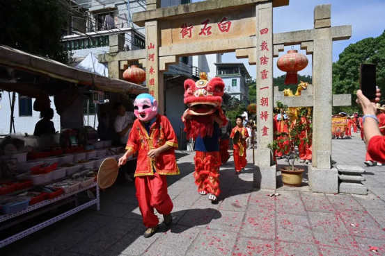 在鞭炮声与鸣锣声中,端午祈福巡游正式开始。从祖庙出发,沿村中道路前进,途经文昌宫、东澳古庙、观音阁、白石街,最后回到祖庙。