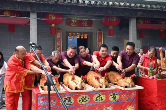 上午8时,淇澳岛热闹非凡,巡游队伍举着旗色,在祖庙前列队准备。巡游开始前,淇澳村民以敬献供品、宣读祭文、敬香、切金猪、祭酒、放礼炮等民俗仪式祈愿天下太平,淇澳子孙昌盛,幸福安康。