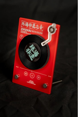 借助互联网 NFC 技术,用手机触碰摆件时,就能听到珠海非遗相关的声音,可能是斗门水上婚嫁源远悠长的咸水歌组曲,可能是三灶鹤舞古朴醇厚的鹤歌,也可能是婉转动听的粤曲和扣人心弦的三弦演奏,让人身临其境般体验非遗韵律。