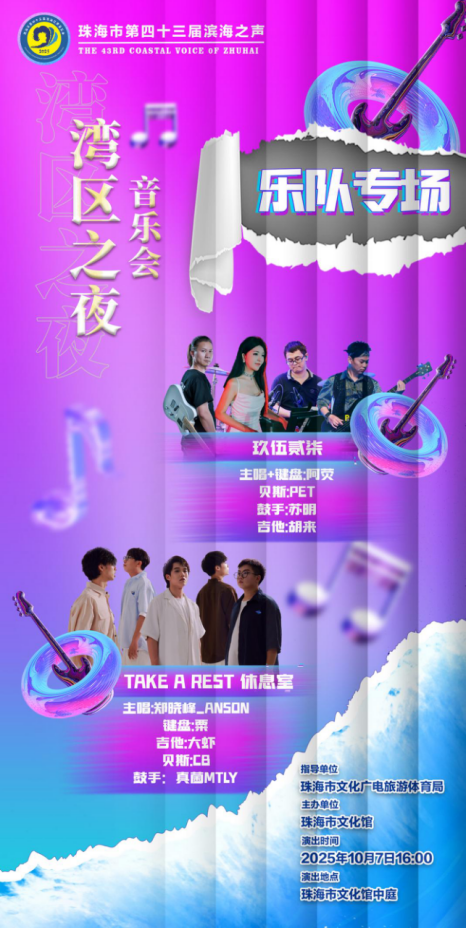 ~当伶仃洋的风,遇上乐队的浪国庆假期的浪漫已为你加载完毕!珠海市第四十三届 “滨海之声” 湾区之夜音乐会 ——乐队专场即将奏响,10月7日16:00,珠海市文化馆中庭,玖伍贰柒乐队与TAKE A REST休息室乐队将联手掀起音浪,用旋律为你的国庆假期画上圆满句点,串联起湾区的青春与热忱。「双乐队炸场」谁是你的本命?