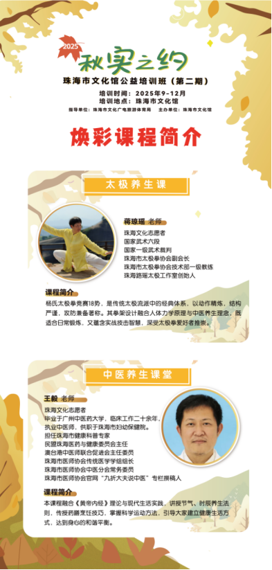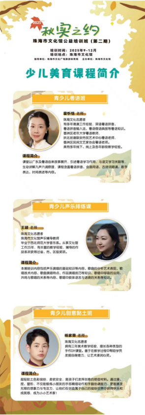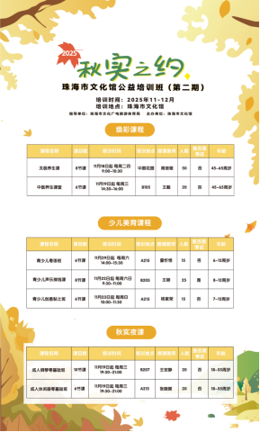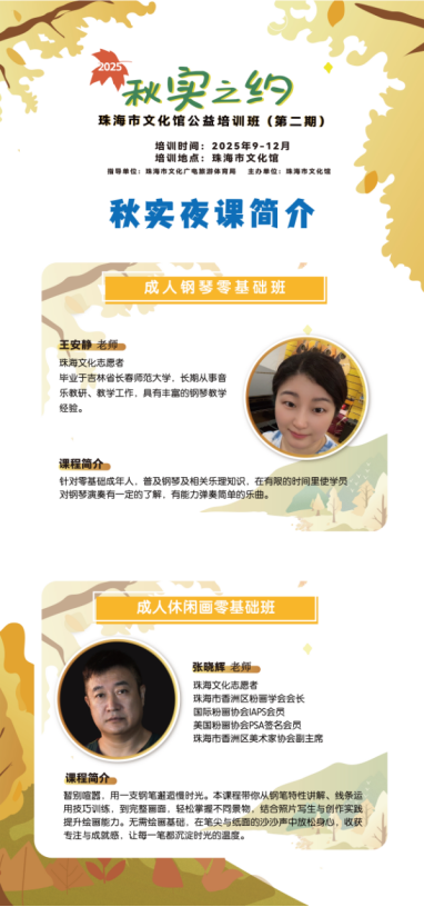 相关说明:珠海市文化馆公益艺术培训班属政府公共文化服务项目,免收培训费用,学员只须自备个人学习用品(如服装、乐器、上课所需物料等),参与者在活动报名前签署《承诺书》。报名成功的学员请按课程表准时上课;授课计划若有调整,将另行通知;报名参加本次公益培训活动将视为您同意主办方在活动期间进行摄影、摄像及录音,并用于活动存档及宣传。