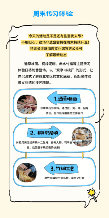 “多彩遵义·非遗万象”综合展览同步在珠海市文化馆展出。展览突破传统图文展陈模式,通过实物陈列、多媒体演示、互动体验区及趣味打卡装置,构建“可观、可听、可感、可互动”的立体文化空间,带领珠海市民深度领略黔北人文山水。