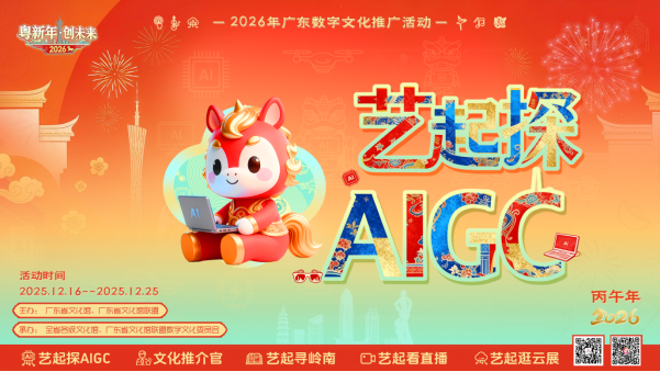 由广东省文化馆、广东省文化馆联盟主办的“粤新年·创未来”2026年广东数字文化推广系列活动之“艺起探AIGC”线上课将于2025年12月16日正式启航!活动旨在繁荣发展互联网条件下的新大众文艺,激活群众文化创作活力,推动AIGC创作与文农旅及广东新年元素相结合,产出一批兼具岭南年味和技术创意的AI短视频,让广大群众在共学共创中体验浓浓的广东年味。