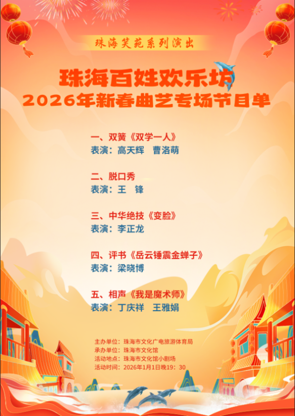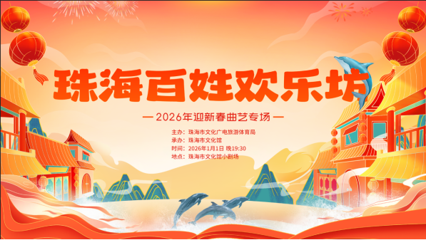 珠海百姓欢乐坊——2026年迎新春曲艺专场由珠海市文化广电旅游体育局主办,珠海市文化馆承办。在2026年新春来临之际,汇聚相声、小品、评书等精彩节目将为珠海市民和游客带来一场迎新春“曲艺喜乐荟”欢乐盛宴。