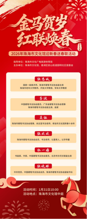 珠海市文化馆诚邀您共赴“金马贺岁,红联焕春”迎新春送春联活动,于笔墨飘香中感受传统年味,在欢声笑语里开启新年的吉祥美好。