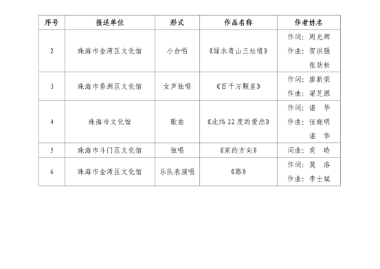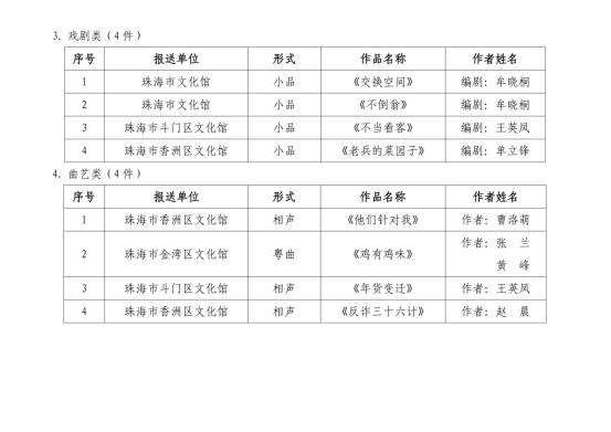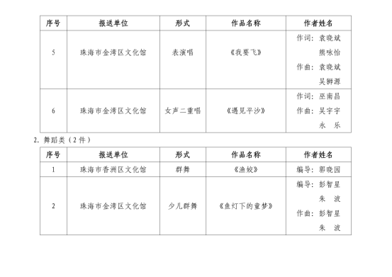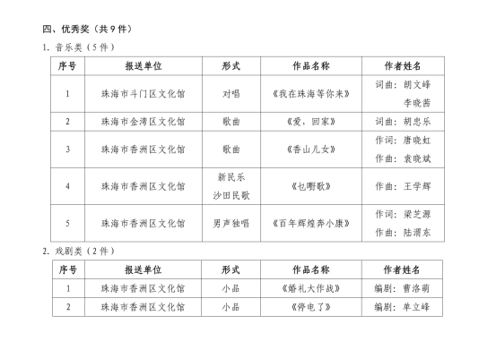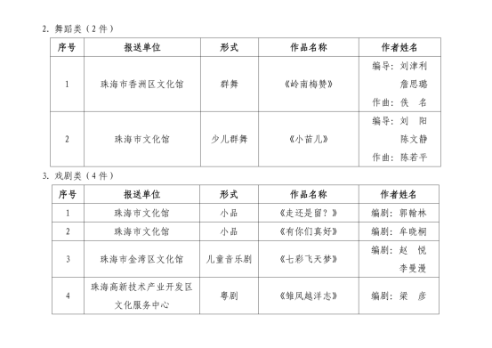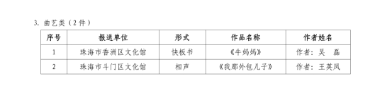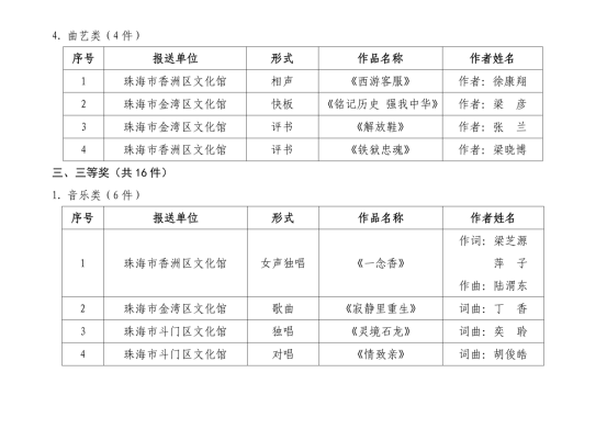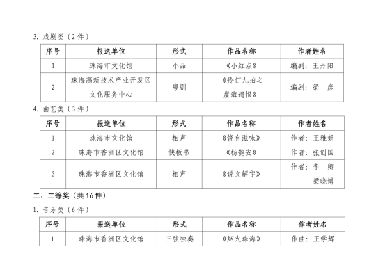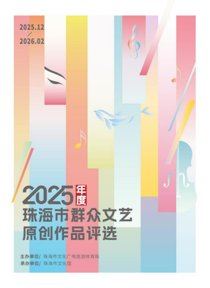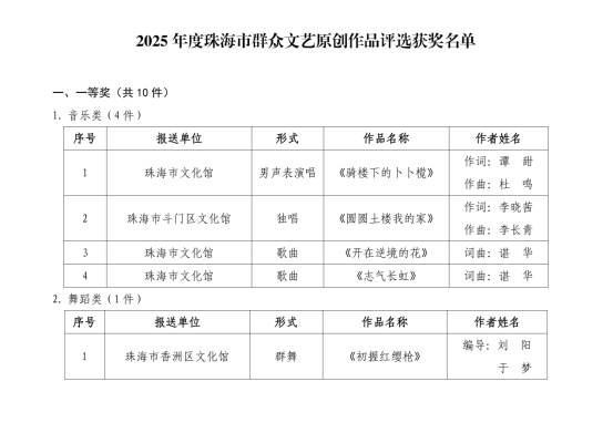 为全面贯彻落实党的二十大和二十届历次全会精神,持续激发基层文艺创作活力,扎实推进我市群众文艺事业高质量发展,顺利对接广东省群众文艺作品评选工作,由珠海市文化广电旅游体育局主办,珠海市文化馆承办的2025年度珠海市群众文艺原创作品评选于2026年1月完成作品评审工作。经专家评审,最终评出音乐、舞蹈、戏剧(含小戏、小品)、曲艺四大门类获奖作品共51件,其中一等奖10件、二等奖16件、三等奖16件、优秀奖9件。现将获奖名单予以公布。